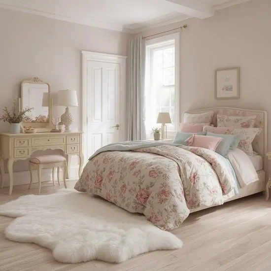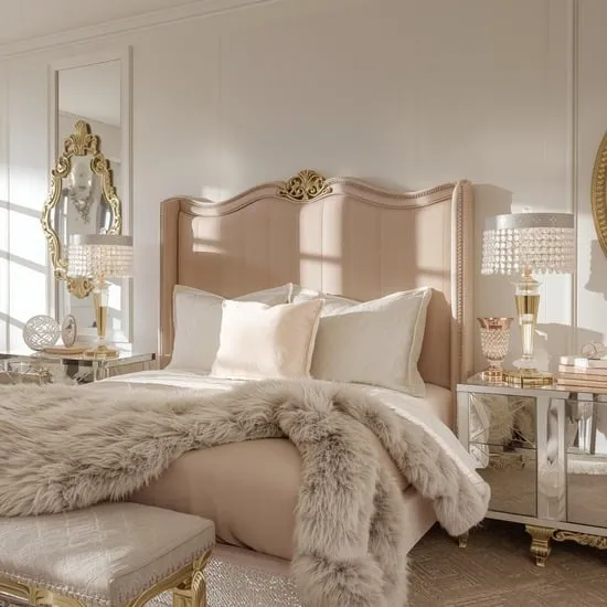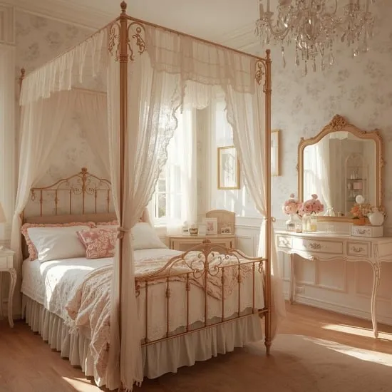 Look for furniture with curved lines, like a tufted headboard or a delicate dressing table. Incorporate floral patterns, lace, or embroidered details on your bedding or window treatments.