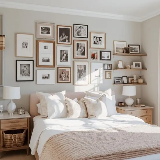 Mix and match framed photos, postcards, small artworks, and even decorative plates or textiles. Play with different frame styles and sizes for an eclectic look, or keep it uniform for a more curated feel.
