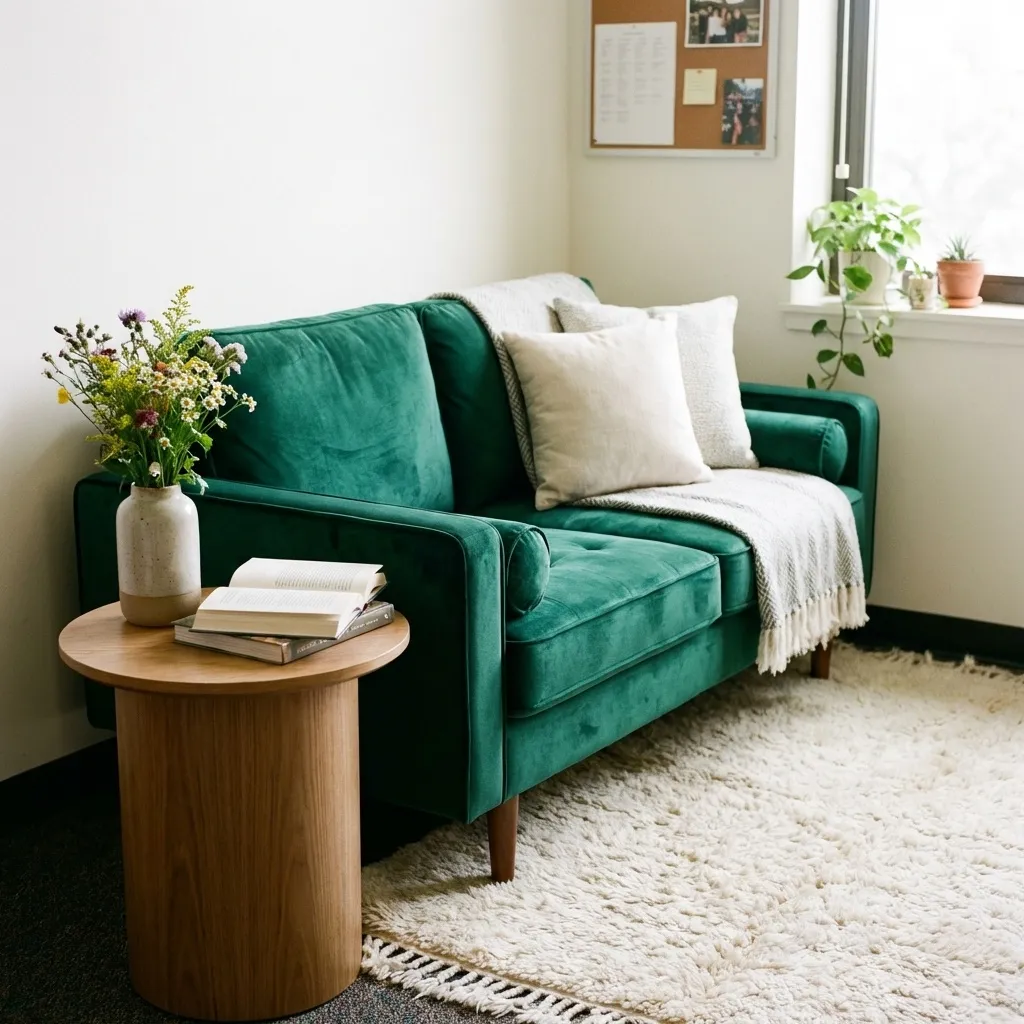 Anchor the area with a soft, patterned rug. It defines the space, adds warmth underfoot, and absorbs sound—a major luxury in a dorm.