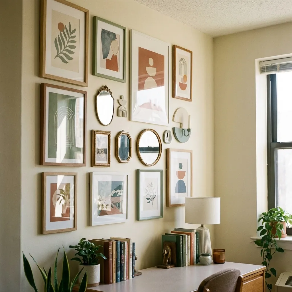 Blank walls feel impersonal. Create a curated gallery wall using a mix of framed art, printable posters, personal photos, and even woven tapestries. I used removable adhesive strips and washi tape to arrange everything without damaging the walls.