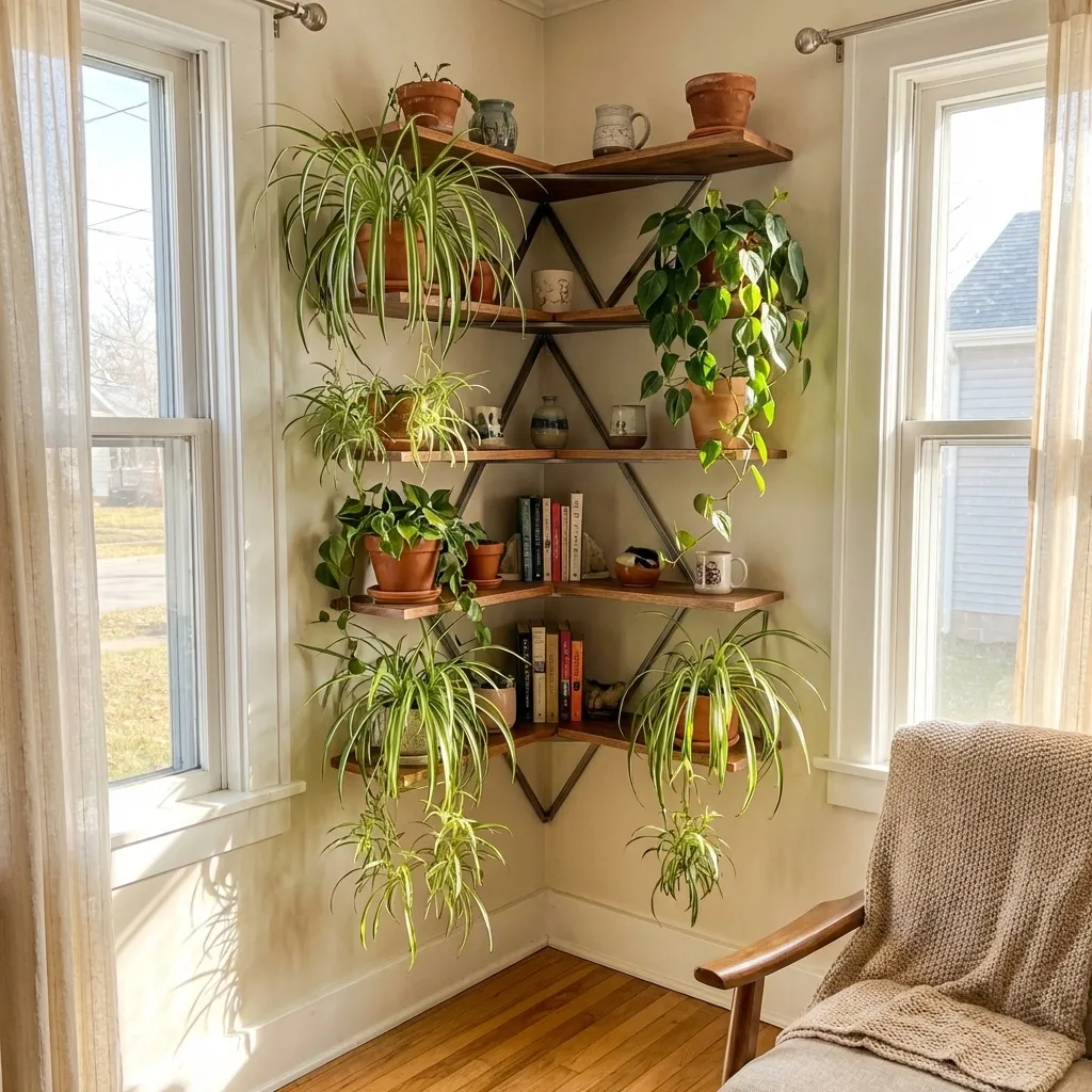 Don’t let those awkward corners go to waste! Installing triangular corner shelves is a genius way to utilize every inch of your room. It transforms a dead space into a vibrant, leafy nook.