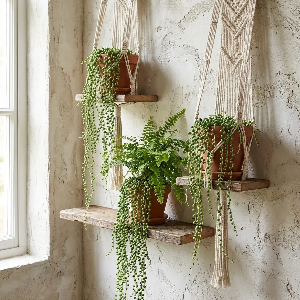 Why choose between a shelf and a hanger when you can have both? I adore combining a solid wood shelf with dangling macramé plant hangers from the bottom. This adds incredible texture and visual depth.