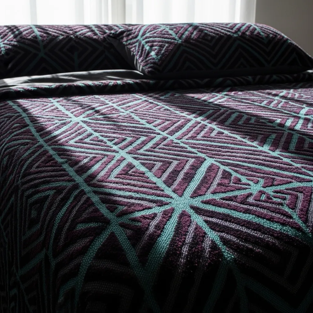 For a cleaner, more contemporary look, use geometric patterns to tie the palette together. A large area rug with intersecting purple and teal lines or shapes defines the space. You can then pull those colors up onto the bed with patterned shams or a graphic blanket.