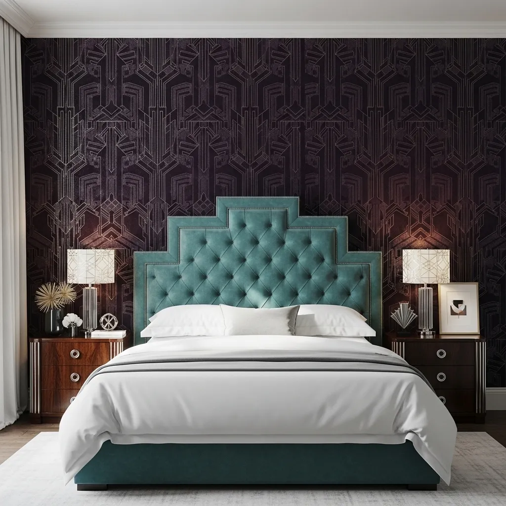 Channel 1920s opulence. Think sharp lines, sunburst mirrors, and high-shine finishes. Paint your walls in a sleek, dark teal. Then, incorporate purple through art deco-style accessories: a shagreen jewelry box, a lamp with a purple glass base, or geometric art.