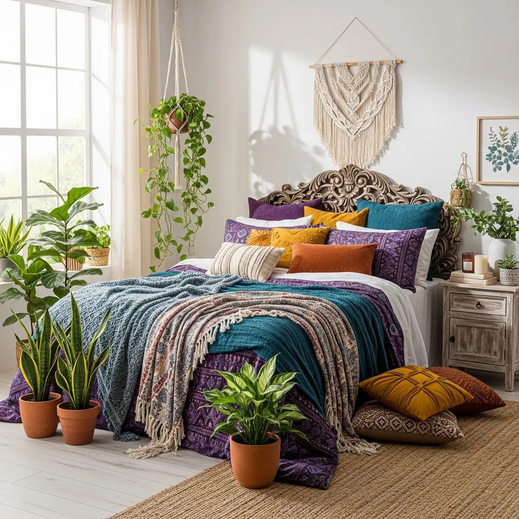 Pair it with solid-colored bedding in one of the two main colors. Think rich teal sheets with purple throw pillows. Keep other furniture simple and in natural materials like rattan, cane, or dark wood to complement the organic vibe without competing.