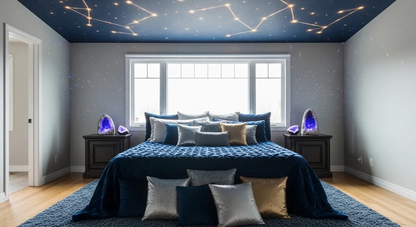 Start with a star projector or glow-in-the-dark decals for your ceiling. Add metallic moon and star motifs, navy blue bedding, and sheer, twinkly fairy lights. A telescope in the corner (even a decorative one) completes the stargazer’s sanctuary feel.