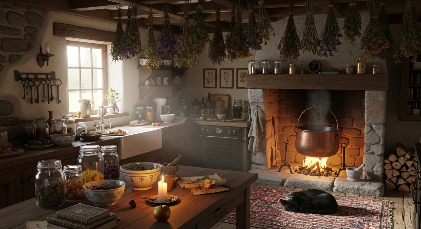 Fill shelves with apothecary jars, old books, and crystals. Use a rich palette of burgundy, forest green, and black. Dried herbs hanging in bundles, a big, worn armchair, and the warm glow of candlelight (or very realistic flameless ones) are absolute essentials.