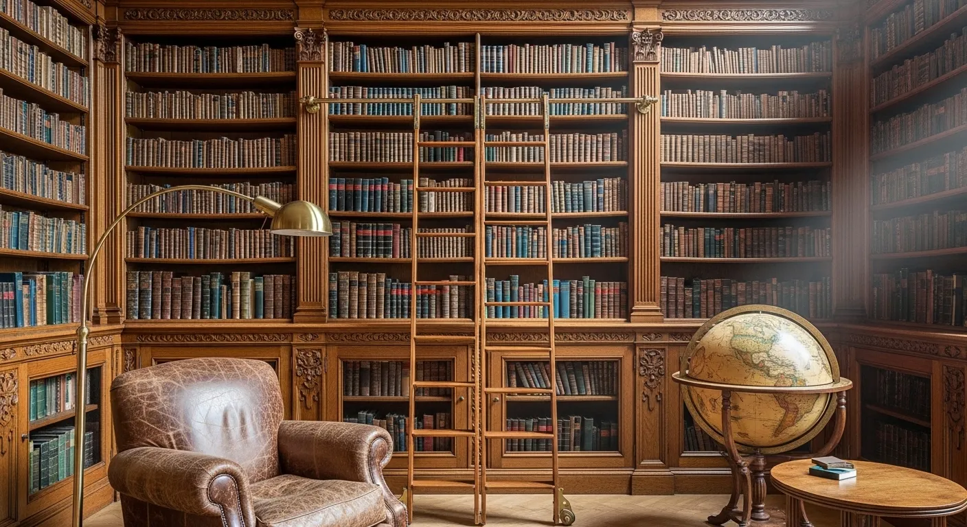 Floor-to-ceiling bookshelves are the dream, but tall bookcases work perfectly. Add a giant, comfy leather chair, a classic library ladder, and a heavy, ornate rug. Globes, antique-looking maps, and a sturdy wooden desk with a green glass lamp set the scene.