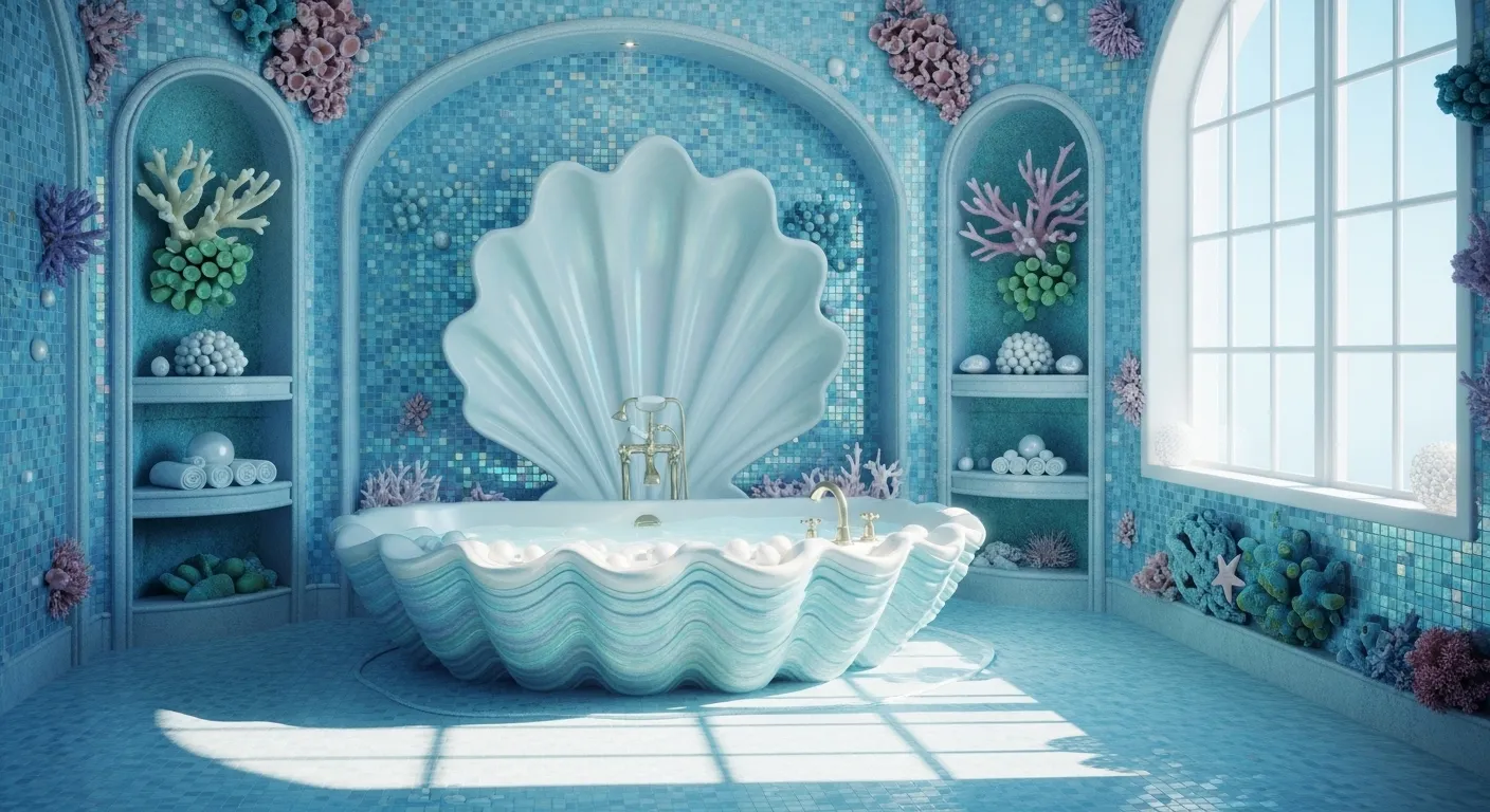 Use a palette of seafoam green, aqua, pearl, and sandy beige. Sheer, flowing curtains mimic seaweed, while glass decor and seashell collections add texture. A pebble or mosaic-style rug and furniture with curved, smooth lines make the space feel like a hidden grotto.