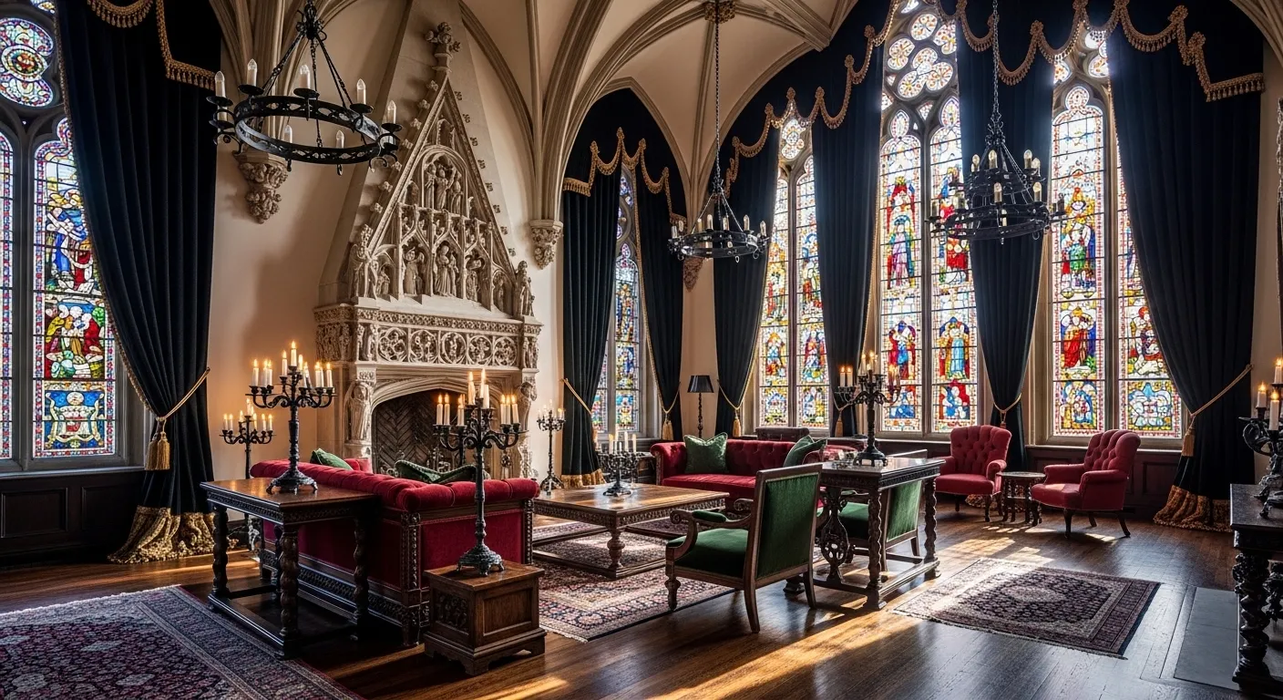 Think arched accents (in mirrors or headboards), deep jewel tones, and rich velvets. Candlestick holders, wrought iron details, and tapestry throws add to the atmosphere. The lighting should be low and dramatic, creating pools of light in a shadowy, elegant space.