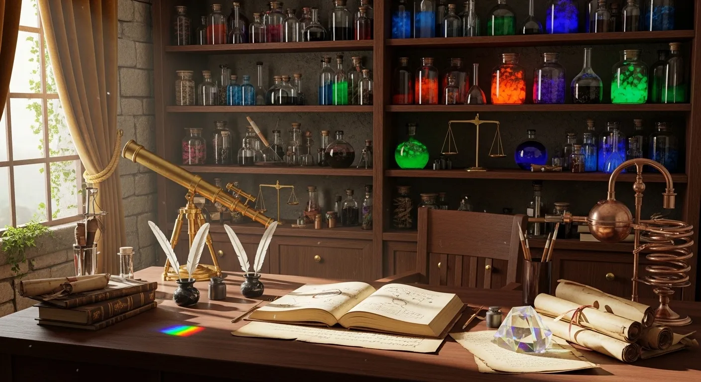 Warm, cluttered, and full of fascinating curiosities. This isn’t about spooky, but about earthy, knowledgeable comfort. Imagine a space where potions are just fancy herbal teas and every object has a story.