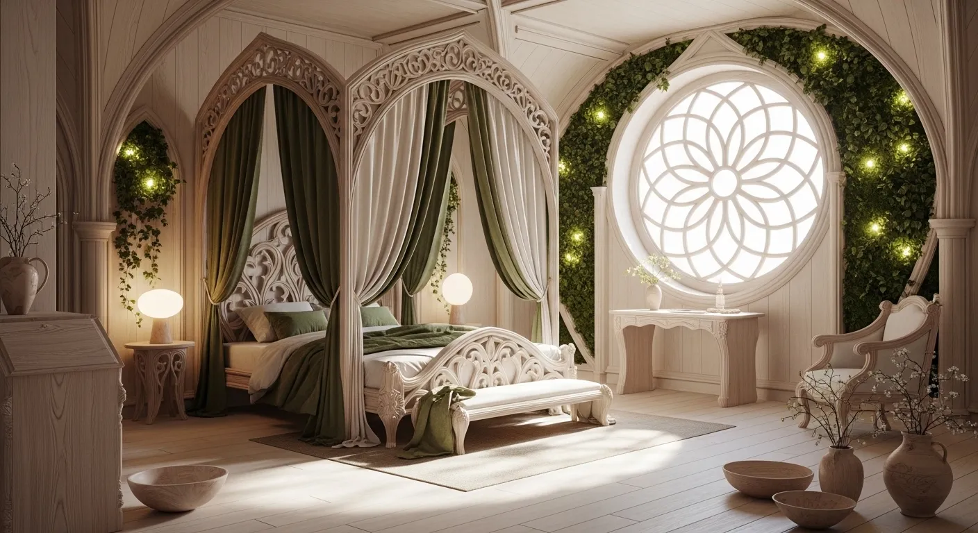Furniture should have flowing, organic shapes, often in light or polished wood. Incorporate lots of natural light, airy fabrics like linen, and art featuring elegant leaves, vines, or deer. Metals are silver or pewter, and everything feels intentionally crafted and serene.