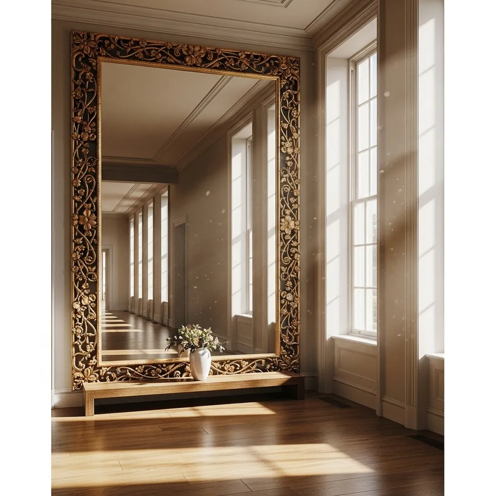 Go for a shape that complements your style: a round sunburst mirror for glam, a clean-lined arch for modern, or a rustic wood frame for farmhouse charm. Position it opposite a light source or above your console table for maximum effect.