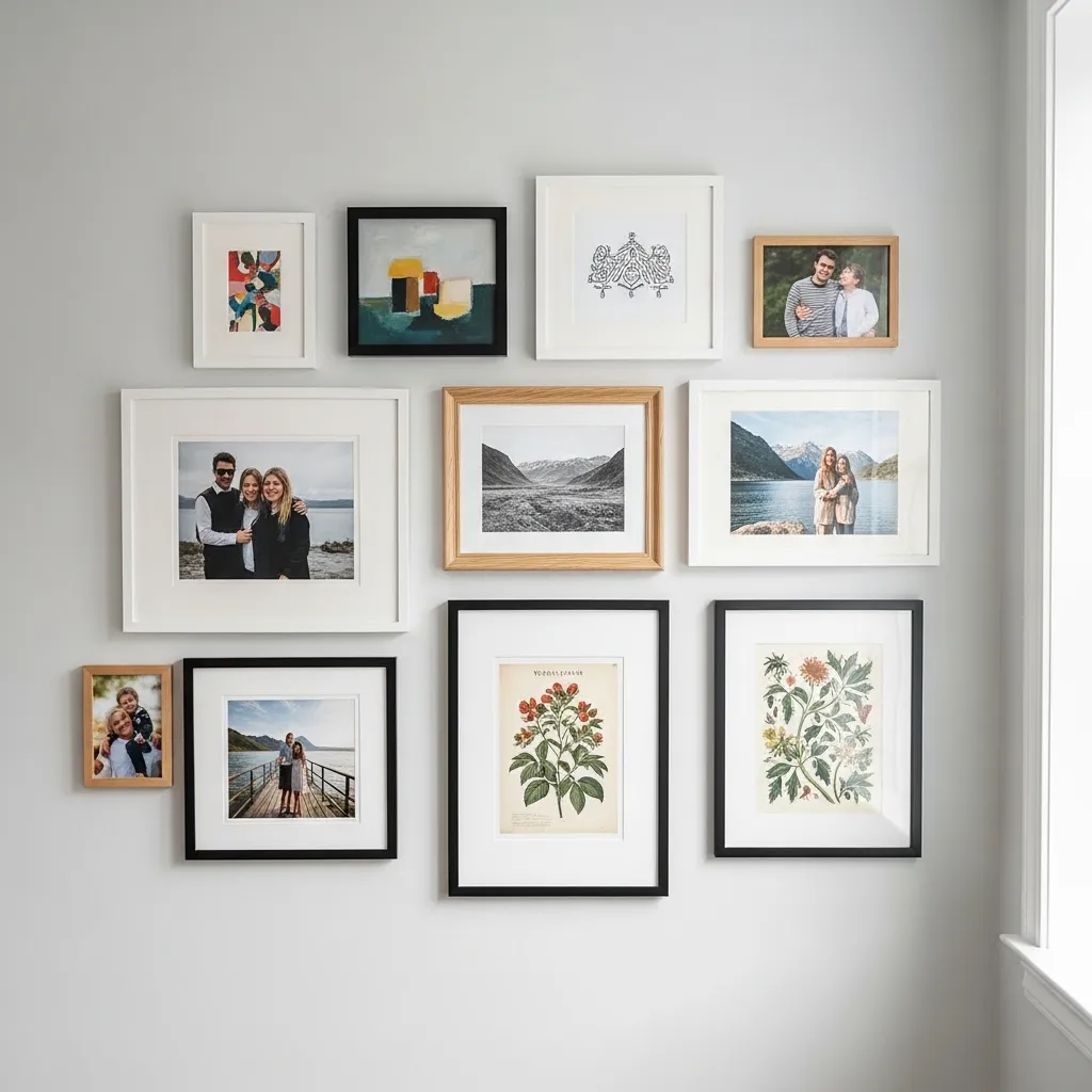 Lay everything out on the floor first to plan your arrangement. Keeping frames in a similar color family (like all black, white, or natural wood) creates a cohesive look even with different art styles.