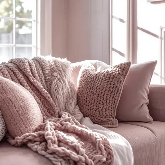 Color isn’t just about paint. Bringing muted pink in through textiles adds instant warmth and dimension. I layered a blush velvet throw pillow on my neutral sofa and added a chunky, rose-hued knit blanket to my armchair.