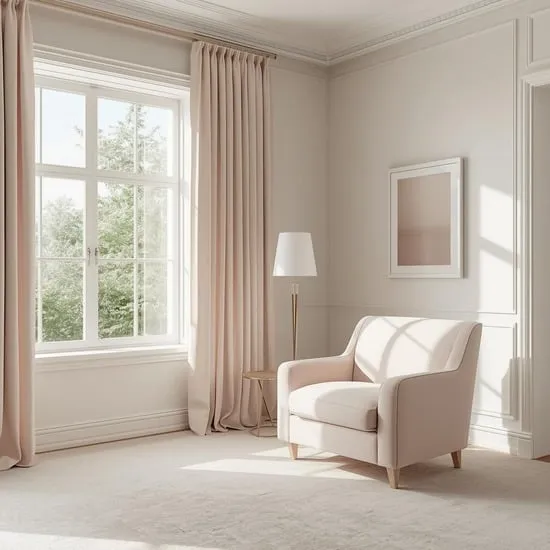 If you crave ultimate softness, pair muted pink with creamy whites and beiges. This combination is like a hug for your senses. I used a cream-colored shag rug, off-white linen curtains, and a pale pink upholstered ottoman.