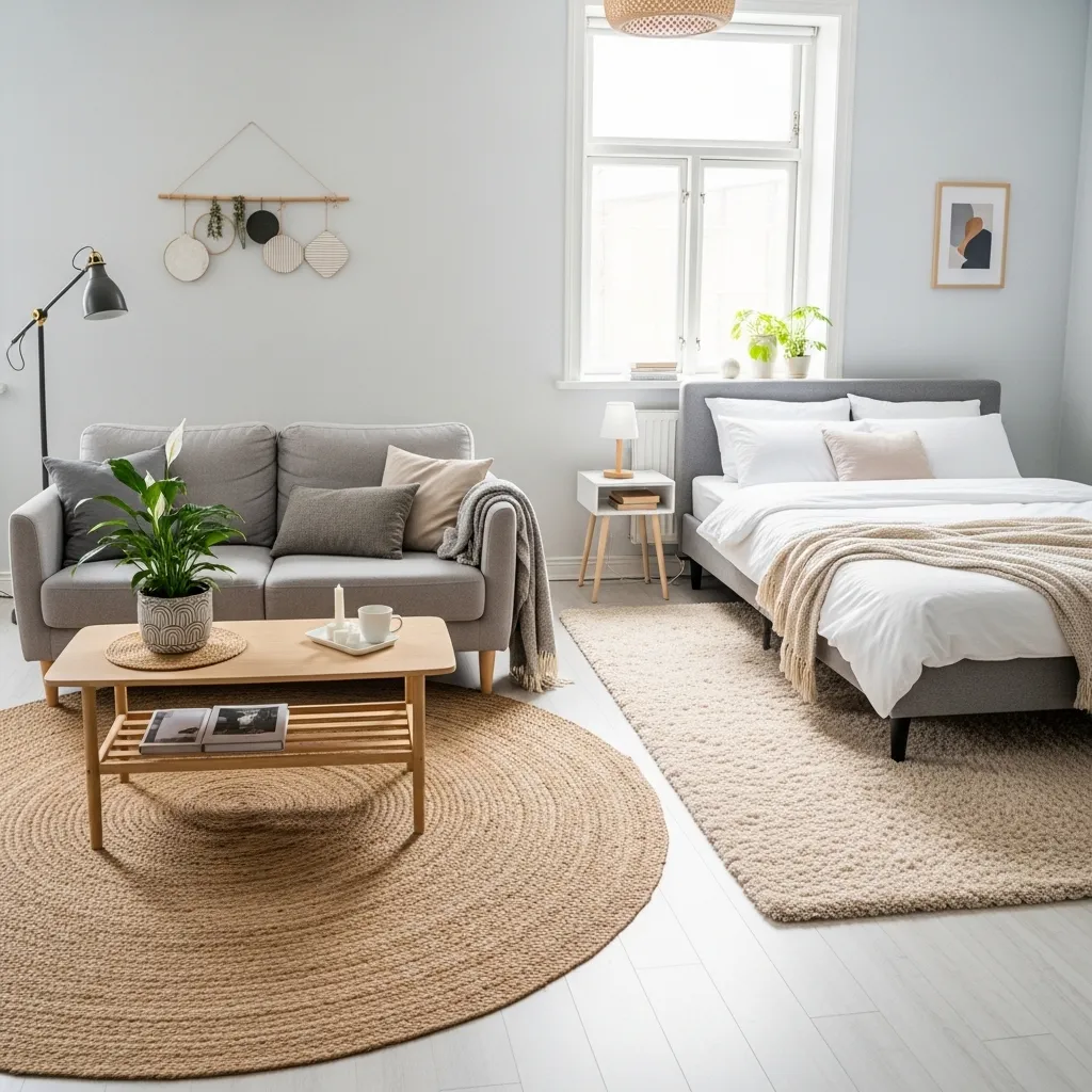 I use one rug to define the living area under the sofa and coffee table, and another to anchor the sleeping space or a reading nook. It helps the room feel organized and intentional, not like everything is just shoved together.
