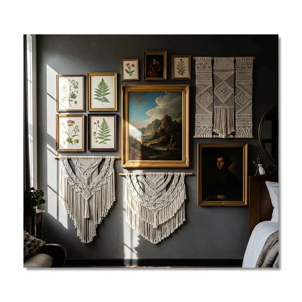 Then, break it up with boho elements: a large macramé wall hanging, a woven tapestry, or a collection of simple wooden frames with abstract art. Hang them in a salon-style cluster for maximum impact. This mix creates a deeply personal and intriguing focal point.