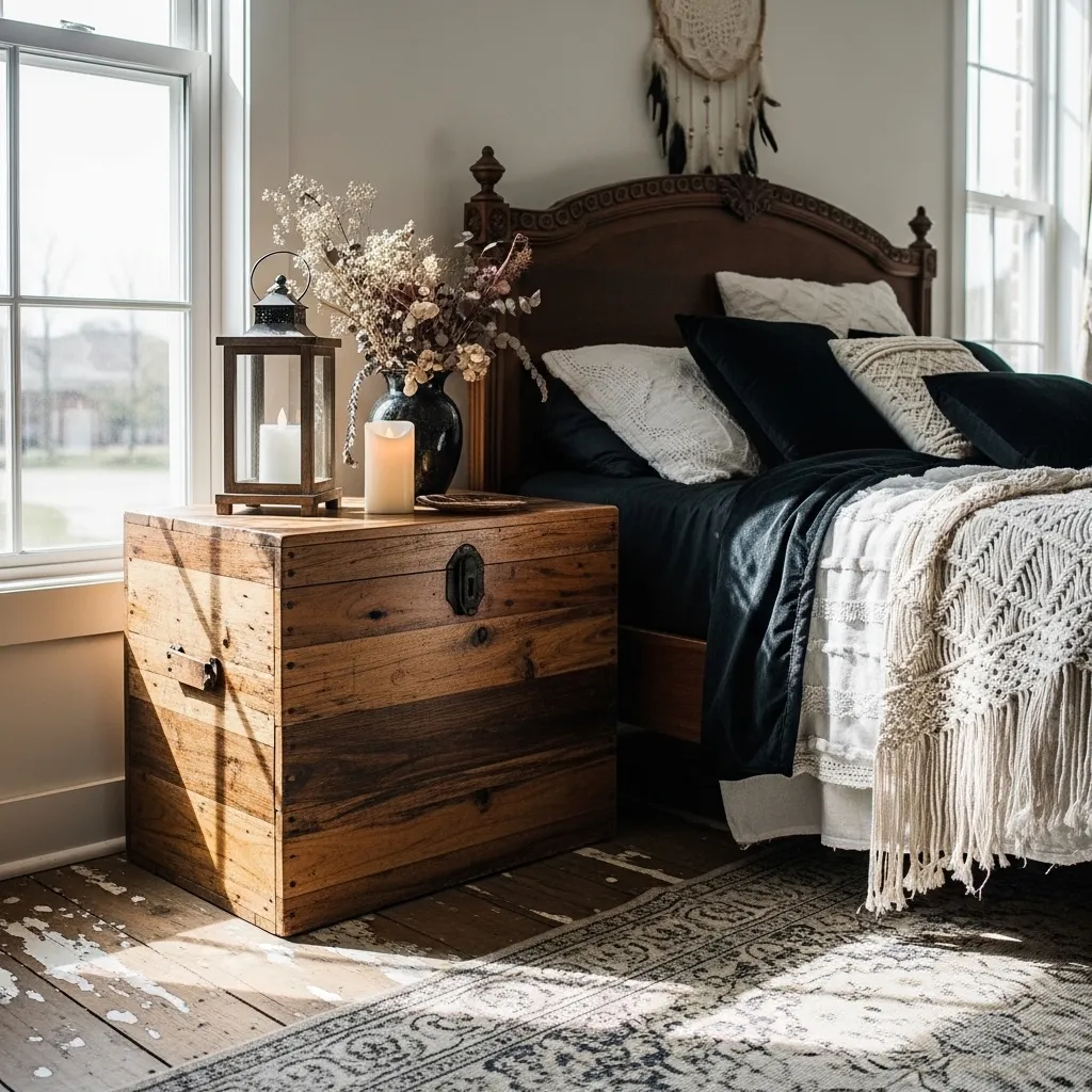 To keep the space from feeling too heavy, bring in the raw, earthy touch of wood. Look for pieces that feel time-worn or hand-hewn. A rustic wooden trunk at the foot of the bed, a live-edge nightstand, or a set of vintage crates as shelves.