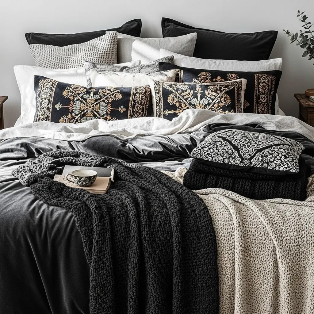 Your bed is the ultimate expression of this style. Start with dark, solid-colored sheets—sateen or linen feel amazing. Then, build a mountain of texture. I mix velvet or chenille quilts with chunky knit blankets, faux fur throws, and a wild array of pillows.