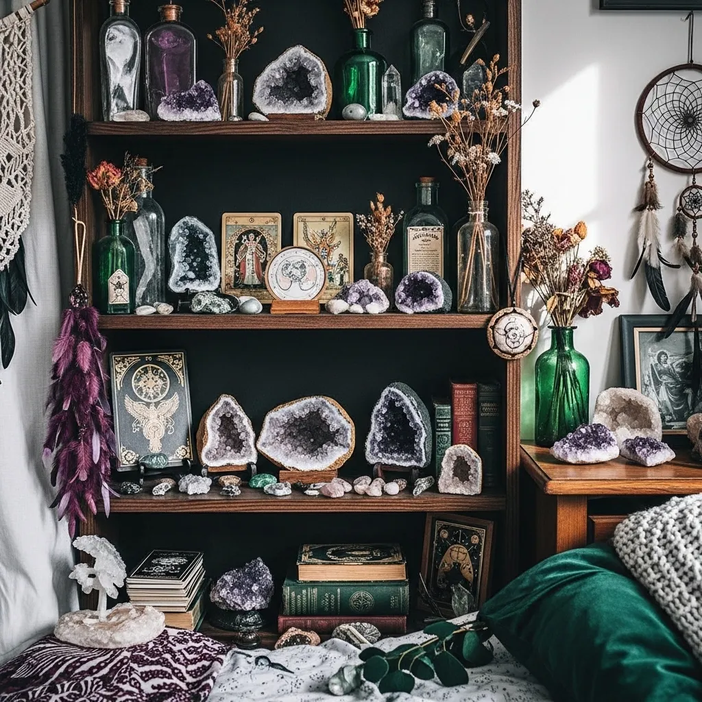 Then, weave in boho spirituality with clusters of crystals (amethyst, selenite, raw quartz), feathers, or dried botanicals like pampas grass. Display them on shelves, nightstands, or in shadow boxes. These small details are the soul of the room.