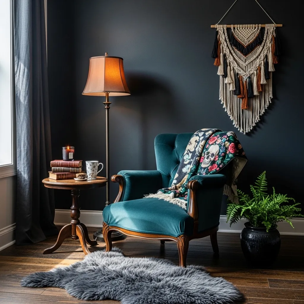 A: Start with paint and textiles! A dark accent wall and thrifted velvet curtains make a huge impact. Hunt for unique frames and mirrors at flea markets, and DIY macramé or shelf displays. Layer rugs you already own.
