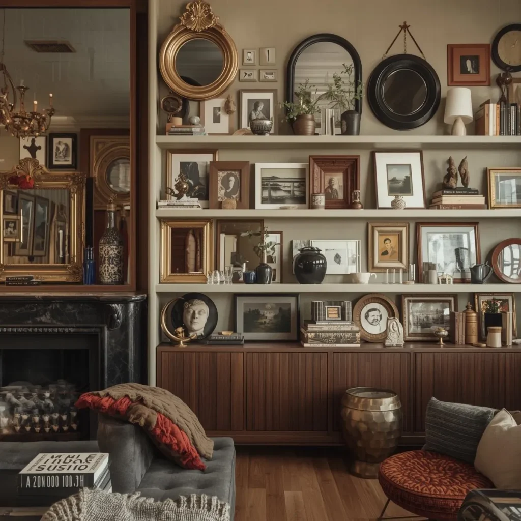 I combined mirrors with shelves and artwork for a layered wall.