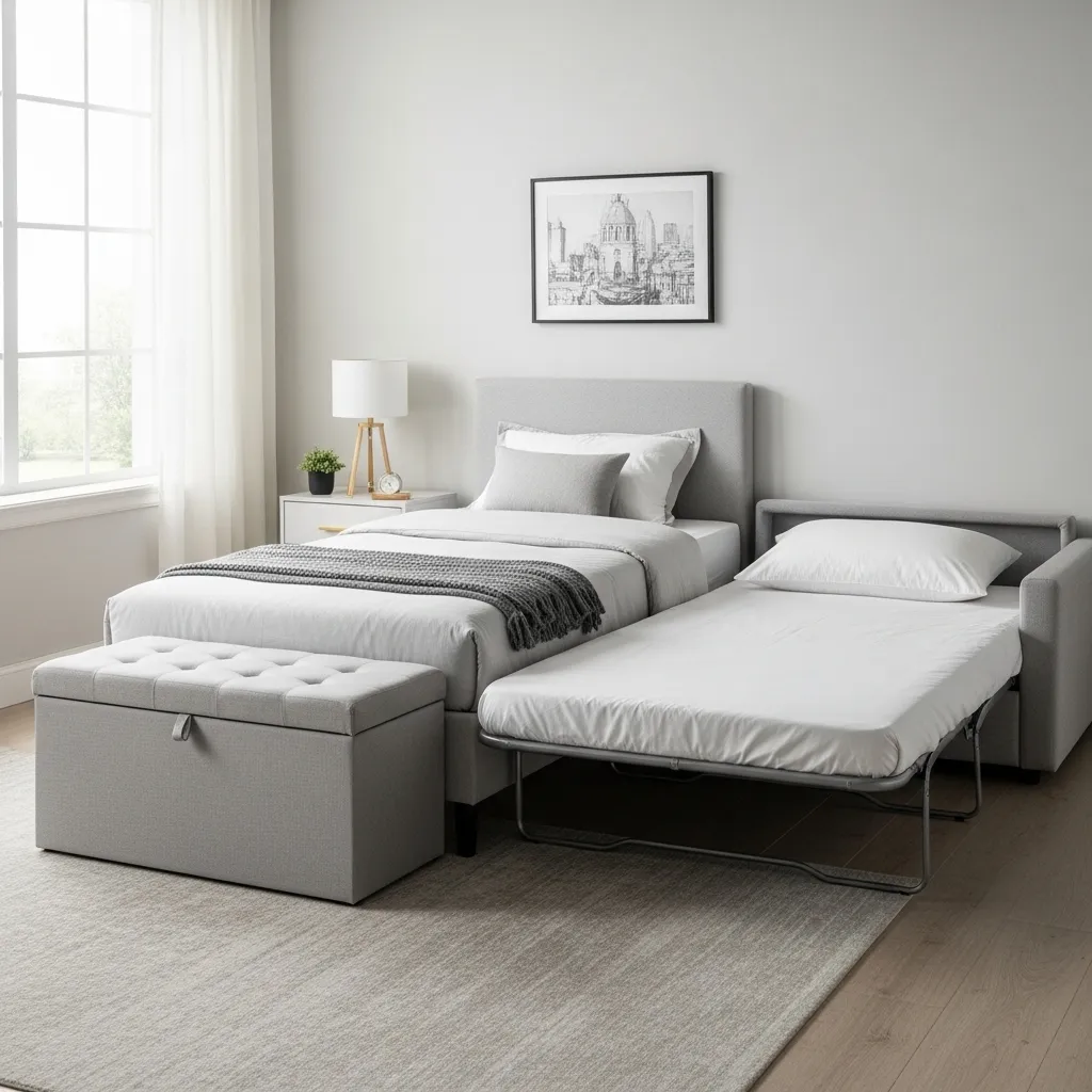 Every piece in a small bedroom should earn its keep. My favorite find? An ottoman at the foot of my bed that opens up for blanket storage. A small desk that doubles as a vanity, or a nightstand with drawers and shelves, are total lifesavers.