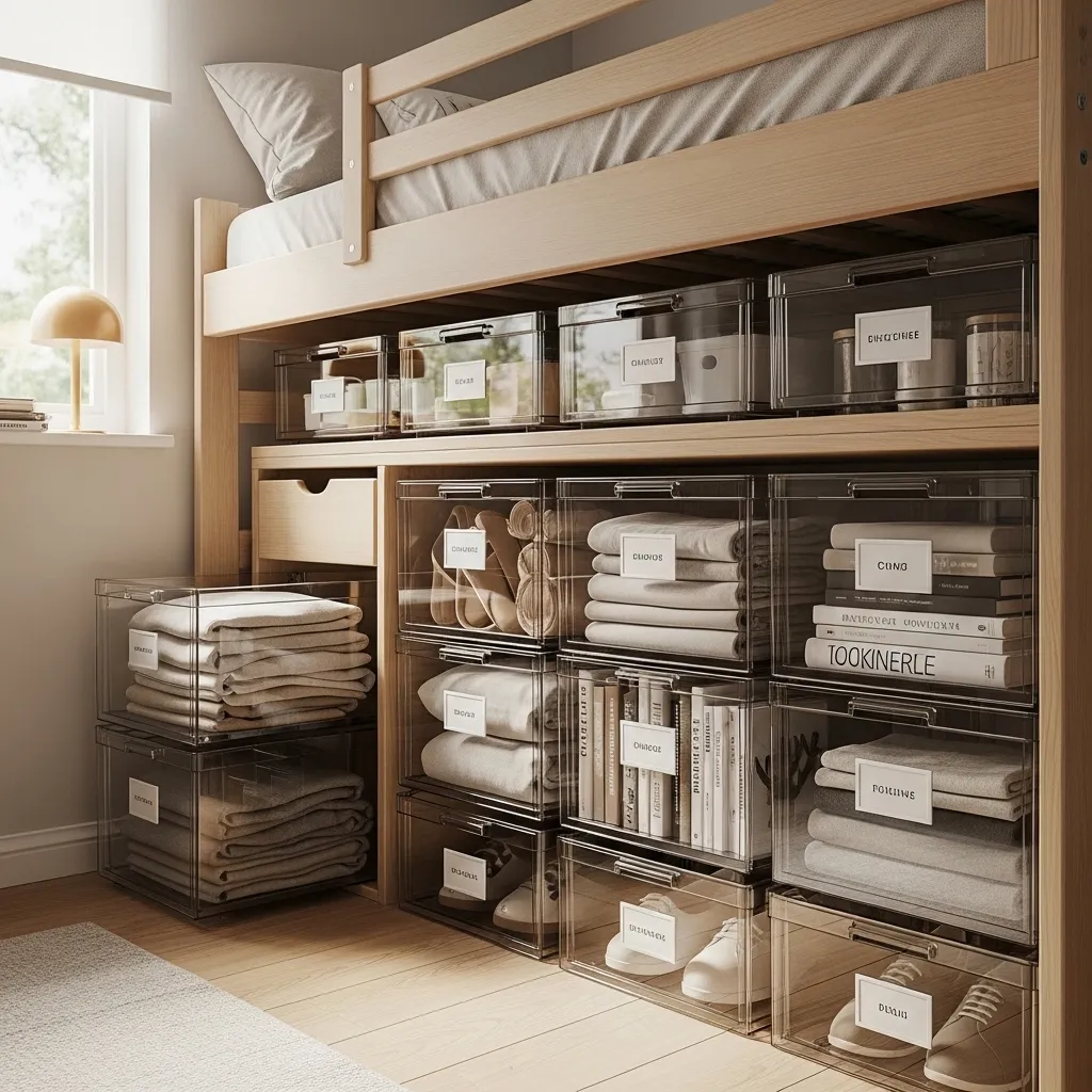 To make it look tidy, use matching containers and a bed skirt or a comforter that drapes to the floor. It’s out-of-sight storage that maximizes every single inch.