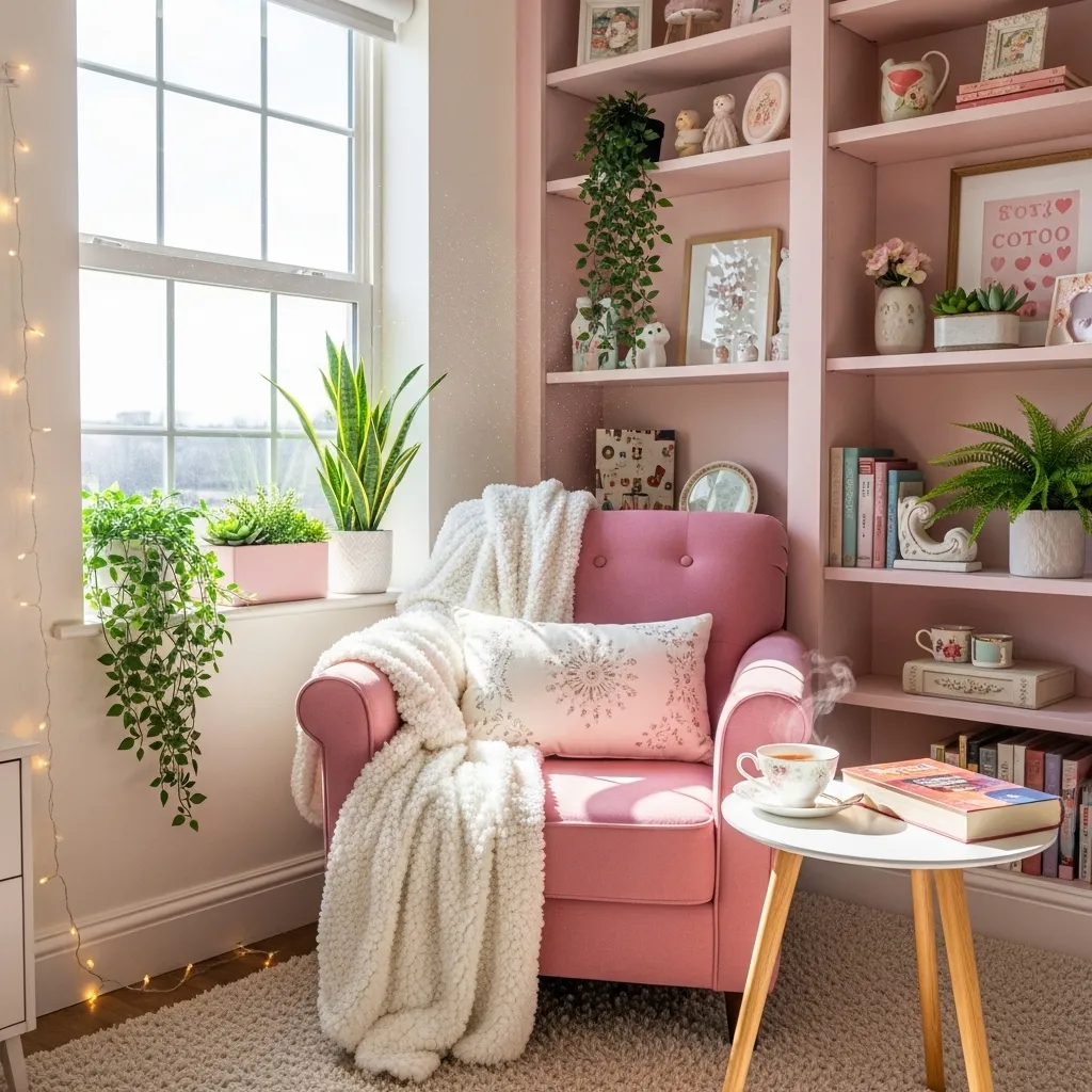 Add a small side table for your tea and a floor lamp with warm, soft lighting. This isn’t just for reading—it’s your go-to spot for scrolling, journaling, or just daydreaming. It instantly adds a layer of intentional coziness to your layout.