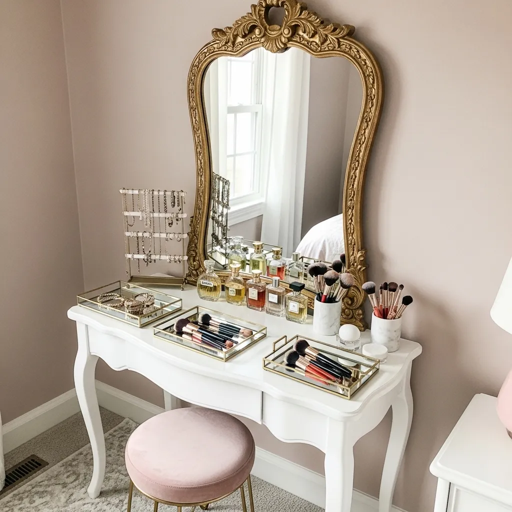 Turn your morning routine into a moment of glamour. A dedicated vanity doesn’t need to be big. A small, ornate table or a sleek console against a wall works perfectly. Use a beautiful tray to corral your favorite perfumes and jewelry.