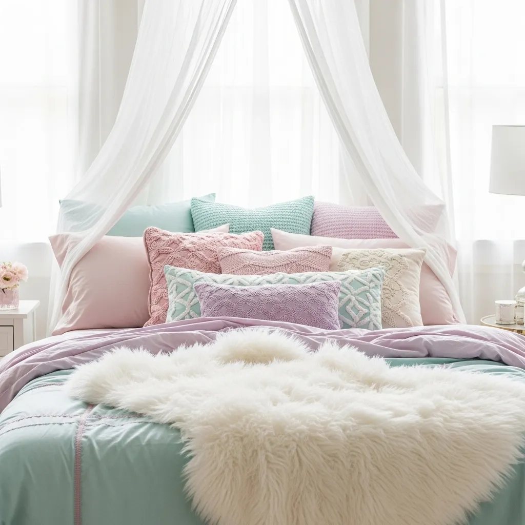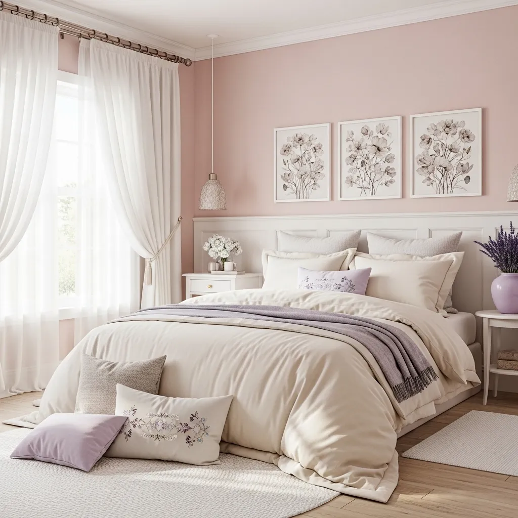 You can’t go wrong with a soothing base palette. Think creamy whites, blush pinks, soft sage greens, and warm beiges. These colors create a calm, airy backdrop that feels instantly inviting.