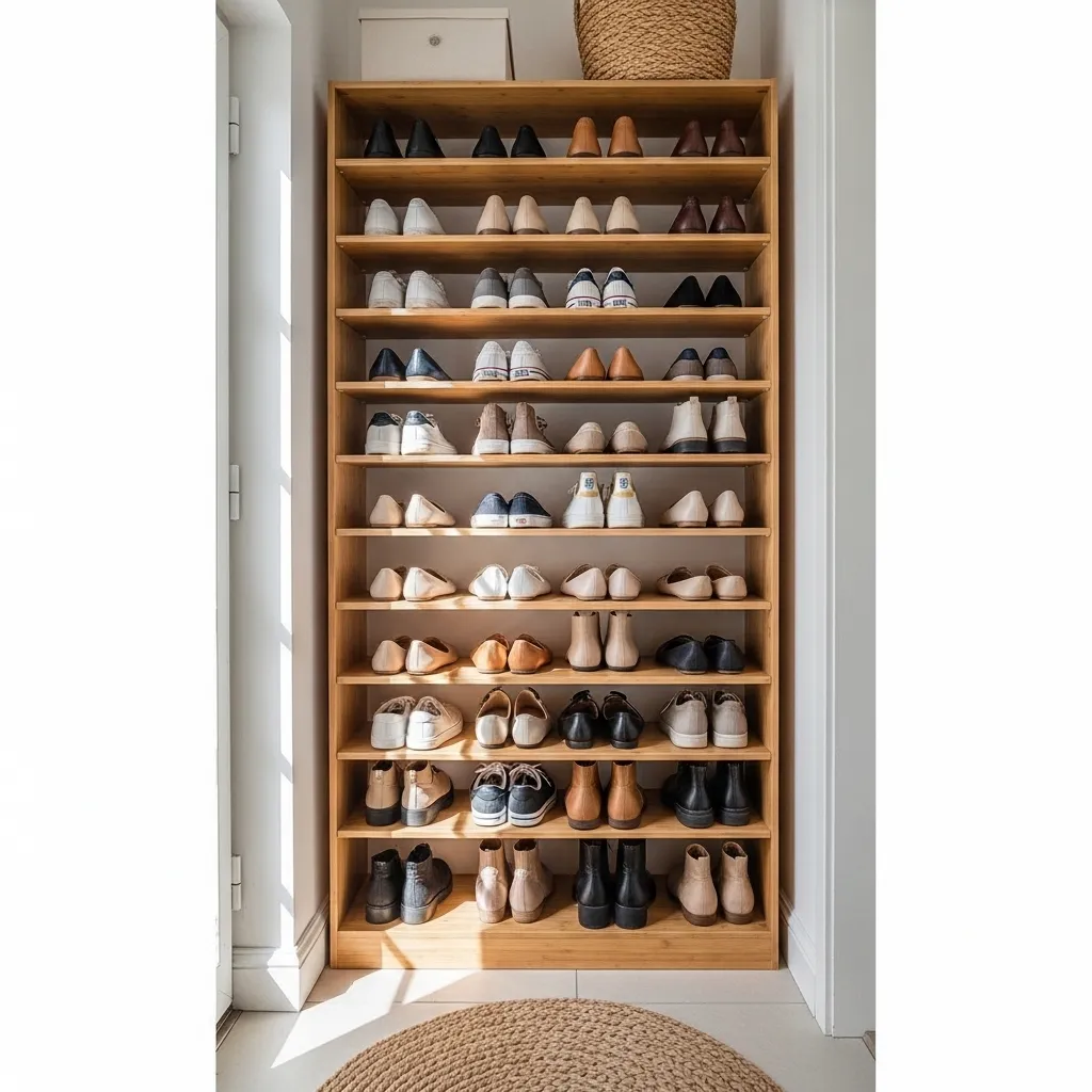Shoes are the biggest culprit of entryway chaos. Instead of a basket that becomes a jumbled pile, think up. A wall-mounted shoe rack or individual shelves keeps pairs organized and off the floor.