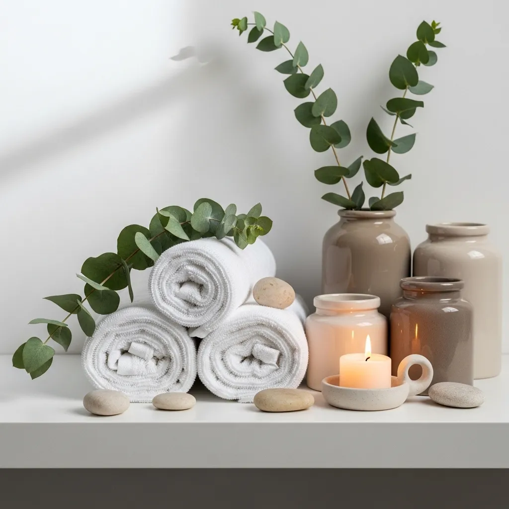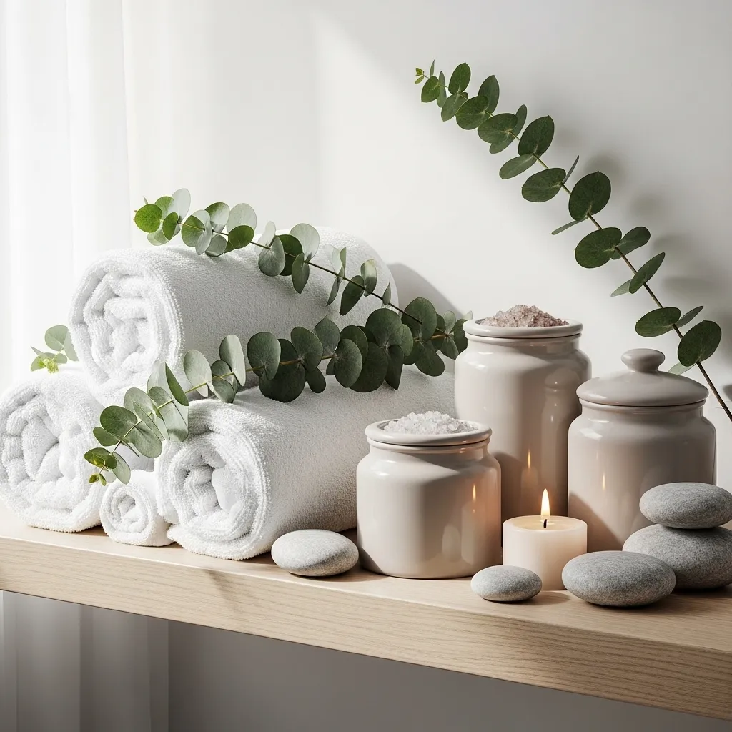 Create a calming retreat with a neutral color palette. Think rolled white towels, woven baskets for storage, and a small potted eucalyptus or snake plant. The greenery is key—it adds a fresh, living element.