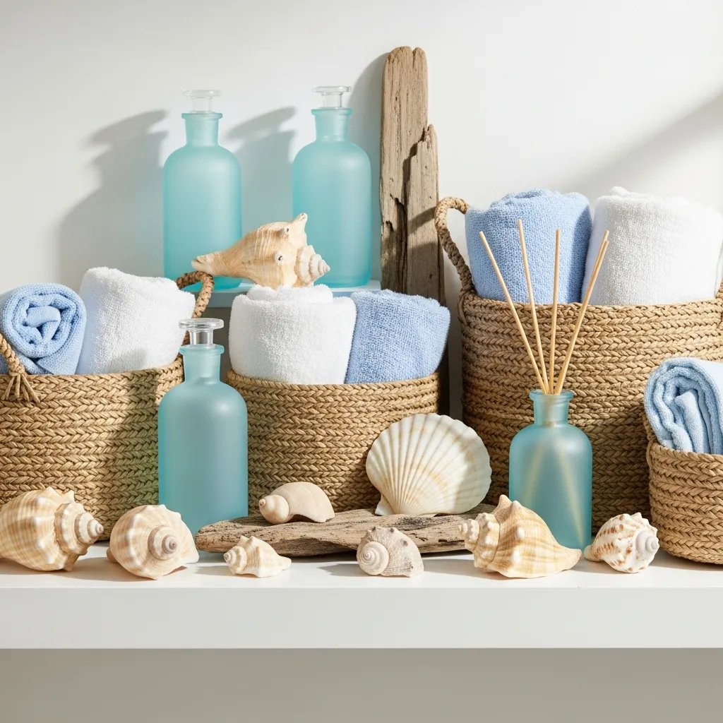 Bring the beach inside with seashells, driftwood, and shades of blue and white. A striped hand towel and a bottle of sea salt spray can be both decor and daily-use items.