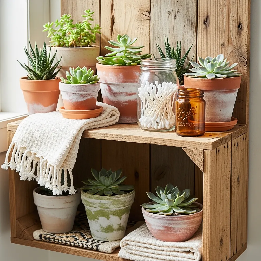 If you have wooden shelves, lean into the natural texture. Style them with terracotta pots holding succulents or herbs like mint that love the humidity.