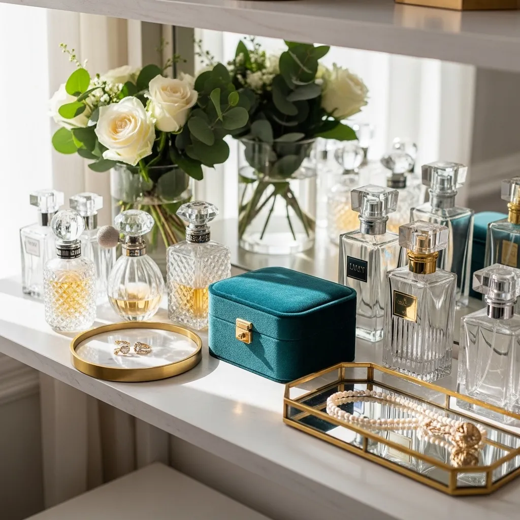 Turn your shelves into a beauty station. Use pretty trays to organize your favorite perfumes, elegant lotion bottles, and decorative jewelry dishes. Treat your everyday essentials as art.