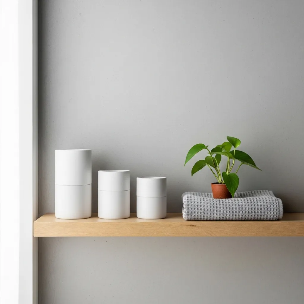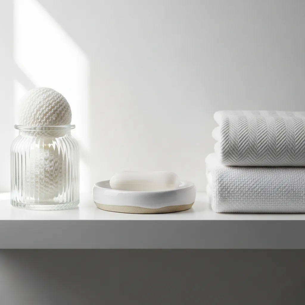 I love using simple glass jars for cotton balls and swabs. It keeps things organized but feels serene. Add a single scented candle in a ceramic vessel to complete the peaceful, spa-ready vibe. It’s my go-to for starting the day calmly.