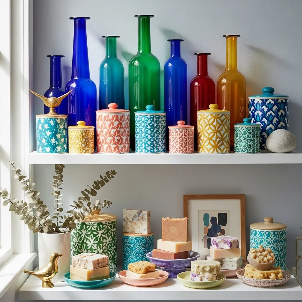 Don’t be afraid of color! Collect vibrant apothecary jars, a bright ceramic vase, or towels in a bold pattern. The trick is to pick two or three main colors and repeat them.