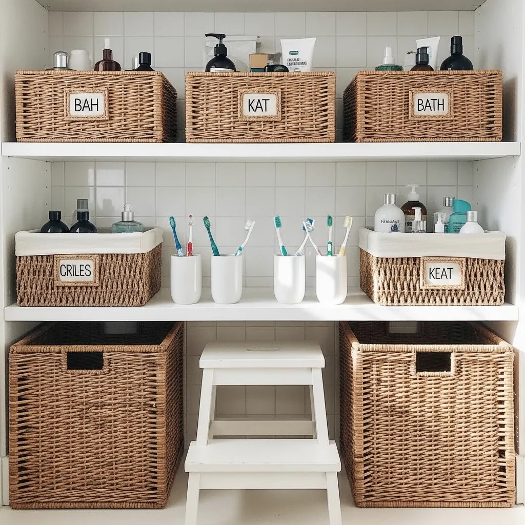 For busy bathrooms, style can still meet function. Use matching labeled bins or baskets for each family member’s items. Keep a stylish canister for toothbrushes and paste.