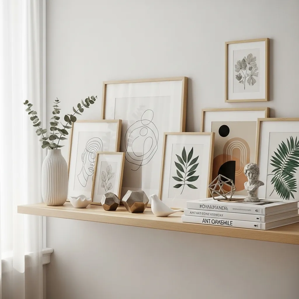Play with heights by layering a frame in front of a basket or vase. This turns your shelving into a dynamic focal point that combines art and object.