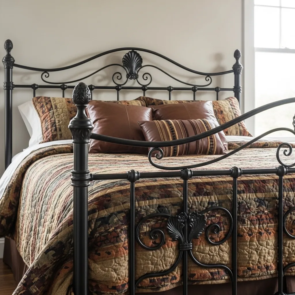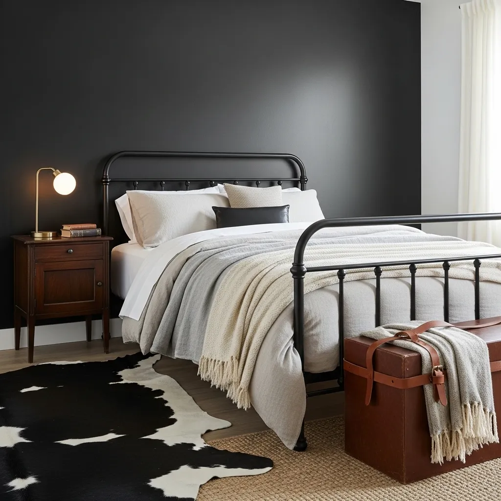 This is a classic Western element that works perfectly with a black palette. A black wrought iron bed frame adds architectural interest and a touch of rugged romance. It feels sturdy and timeless.