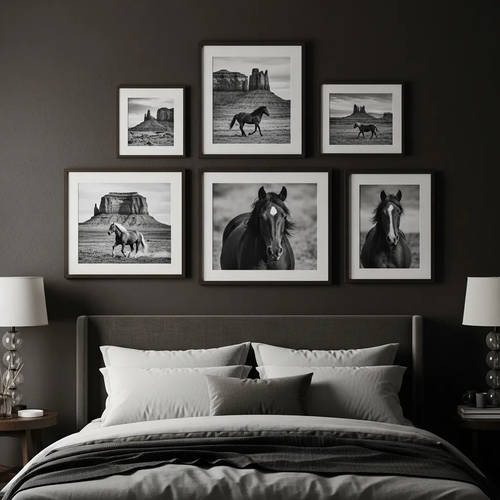 Art is key for personality. Frame a series of black and white landscape photos—think sweeping deserts, mountain ranges, or classic cowboy portraits. The monochrome palette ties into your color scheme while adding a narrative element.