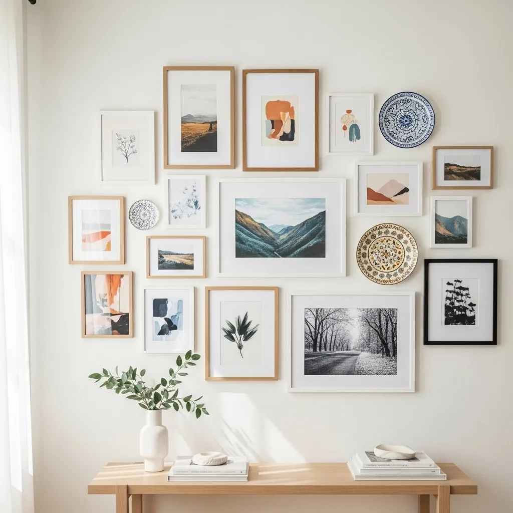 Blank walls can feel sterile. I love filling mine with things that make me smile. A gallery wall doesn’t have to be perfect. I mix framed photos, postcards, small pieces of art, and even pressed leaves in frames.
