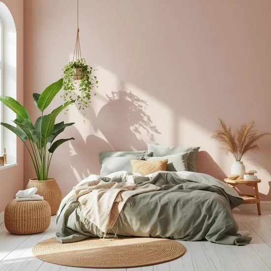 Create a carefree, collected feel with boho pink. Mix patterns like ikat, stripes, and embroidery in pink and cream tones. Incorporate macramé wall hangings, plenty of plants, and a floor pouf.