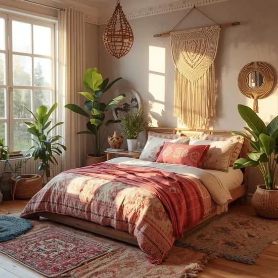 Add dried pampas grass, terracotta pots, and woven textures. It feels like a peaceful garden sanctuary, bringing the calm of the outdoors right into your sleep space.