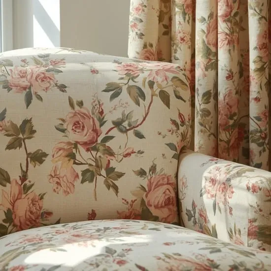 I use baskets for storage and texture, and a natural fiber rug to ground a seating area. This balance between the feminine florals and rustic elements is what makes the style feel so liveable and grounded.