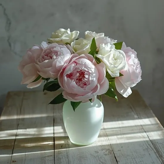 I keep it loose and garden-style—think a handful of roses, peonies, or even wildflowers in a mason jar, milk glass vase, or pitcher. They add color, fragrance, and a beautiful, fleeting freshness to the room.