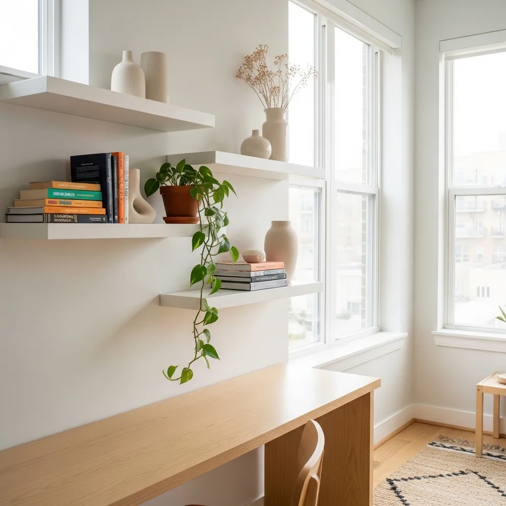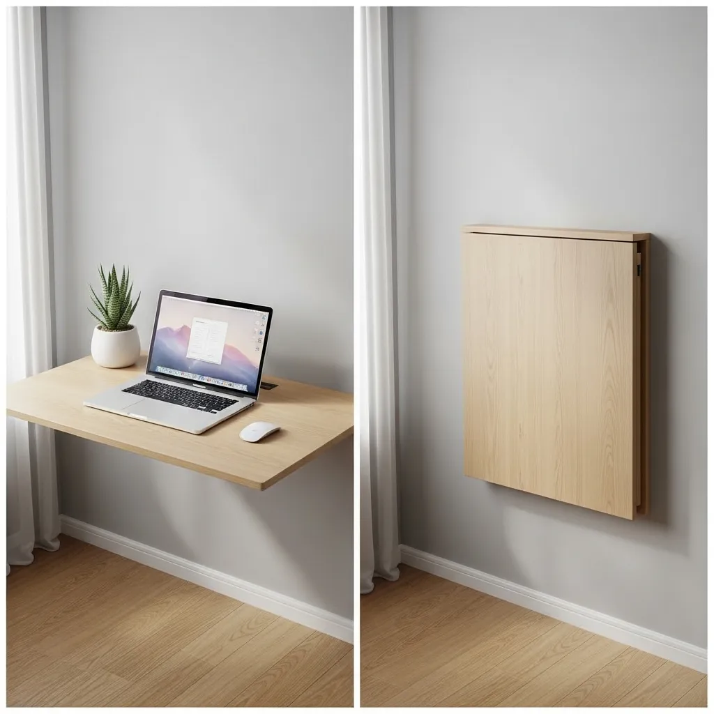 Pair it with a wall-mounted shelf above for supplies. When you’re done working, simply fold it up, and your “office” vanishes, leaving your living space completely clear.