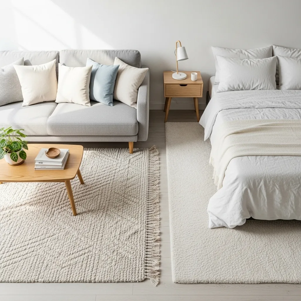 Even without walls, you can define areas with texture underfoot. I use a plush rug under my bed “zone” and a flat-weave jute rug under my living area. The different textures and patterns subconsciously tell you where one area ends and another begins.